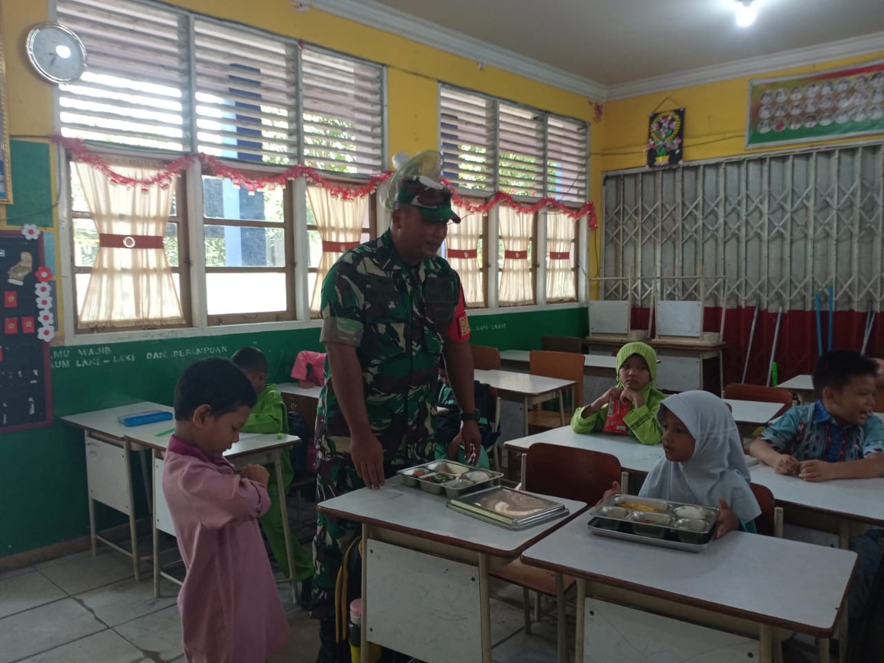 Babinsa Sertu M Fauzi Dampingi Pembagian Makanan Bergizi untuk Siswa SDN 100.