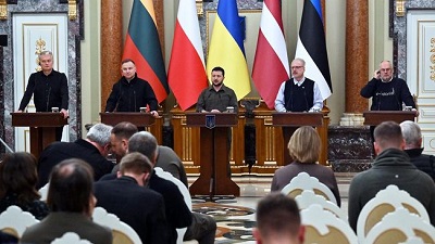Presiden Polandia, Lithuania, Latvia, dan Estonia bertemu dengan Presiden Ukraina Volodymyr Zelensky di.