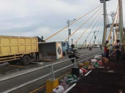 Satu unit truk dengan plat nomor BK 9802 DD bermuatan air mineral merek Cleo terguling di jembatan Tengku Agung sultanah Latifah (TASL) Kabupaten Siak, Sabtu.