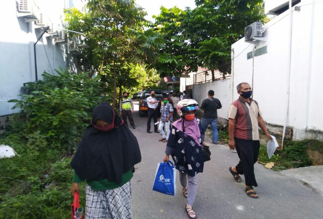 Kerumunan warga yang tengah mengurus pencairan Bantuan Langsung Tunai (BLT) di Jalan Harapan Raya, tepatnya di belakang.