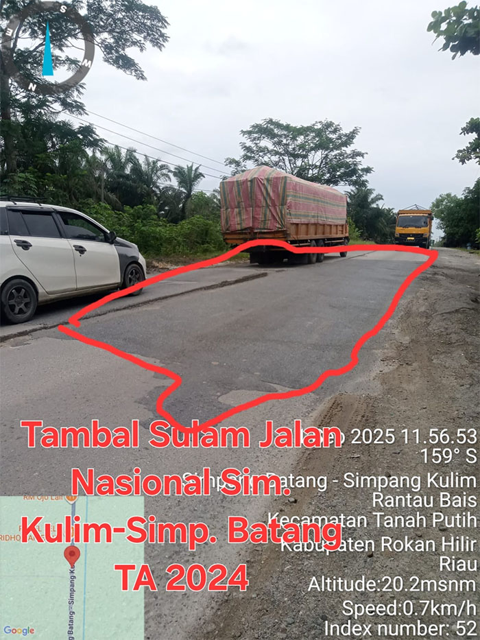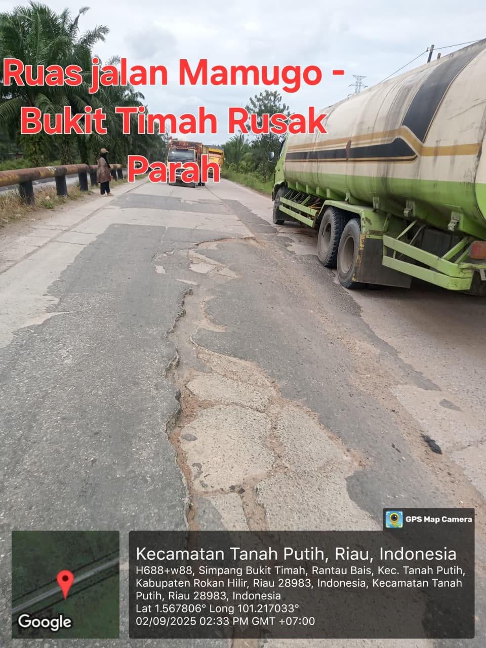 Kerusakan ruas jalan Nasional Desa Mamugo Tanah Putih menuju Bukit Timah Mekarsari Dumai Selatan Kota Dumai bahwa jalan nasional di bawah pengawasan dan perbaikannya merupakan tanggung.
