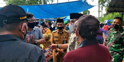 Camat Bukitraya, Tengku Ardi Dwisasti, S.STP., M.Si, meninjau langsung penerapan protokol kesehatan (Prokes) di Pasar Kaget Sapta.