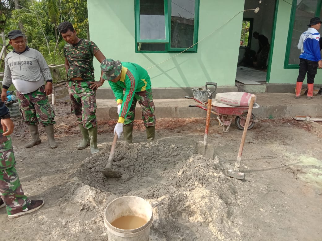 Terlihat mahir dalam aduk mengaduk adonan pasir bercampuran dengan semen dan air untuk dipergunakan rehab rumah tidak layak huni yang menjadi sasaran fisik TNI Manunggal Membangun Desa (TMMD) Kodim 0301.