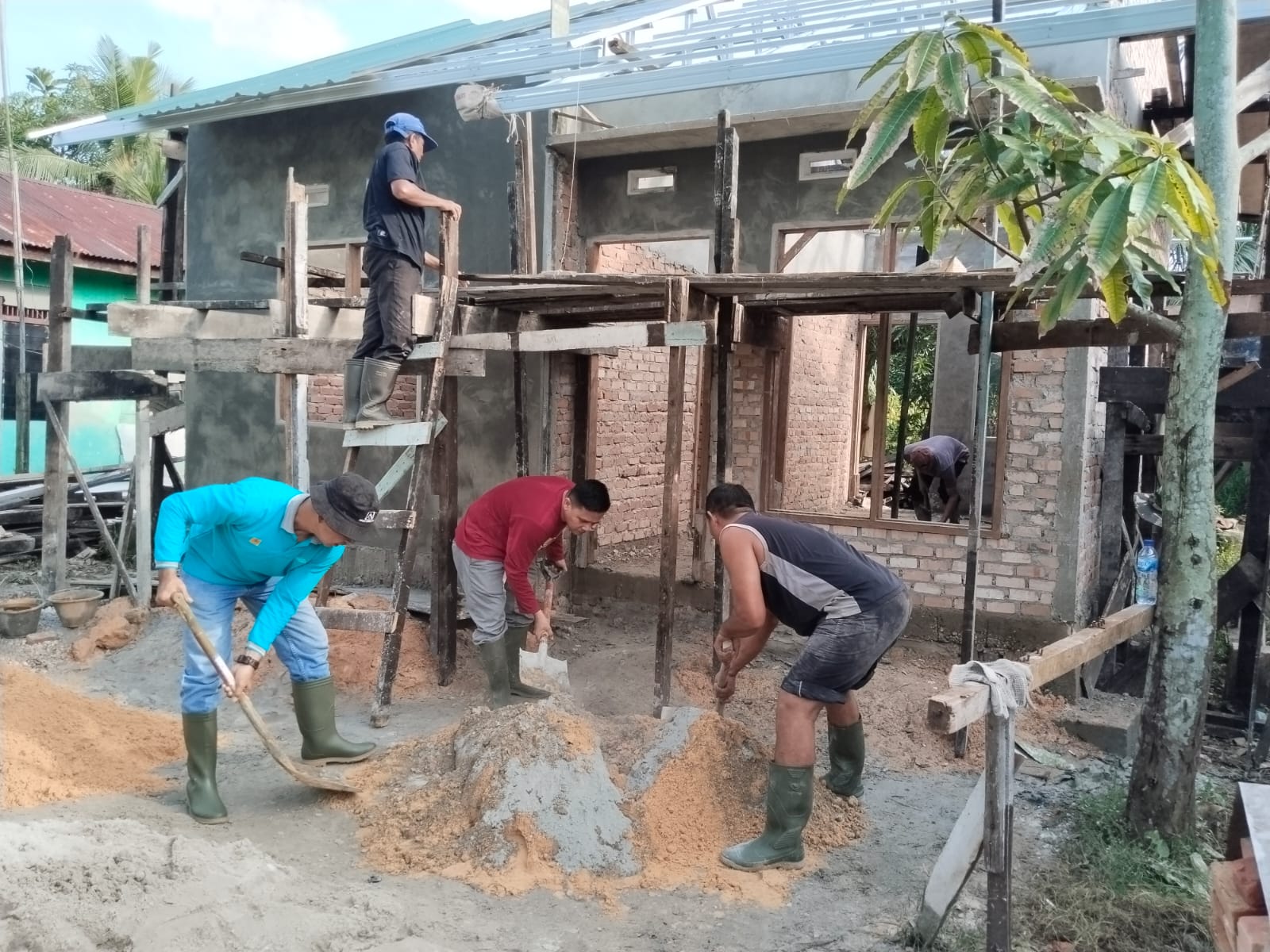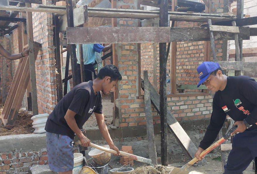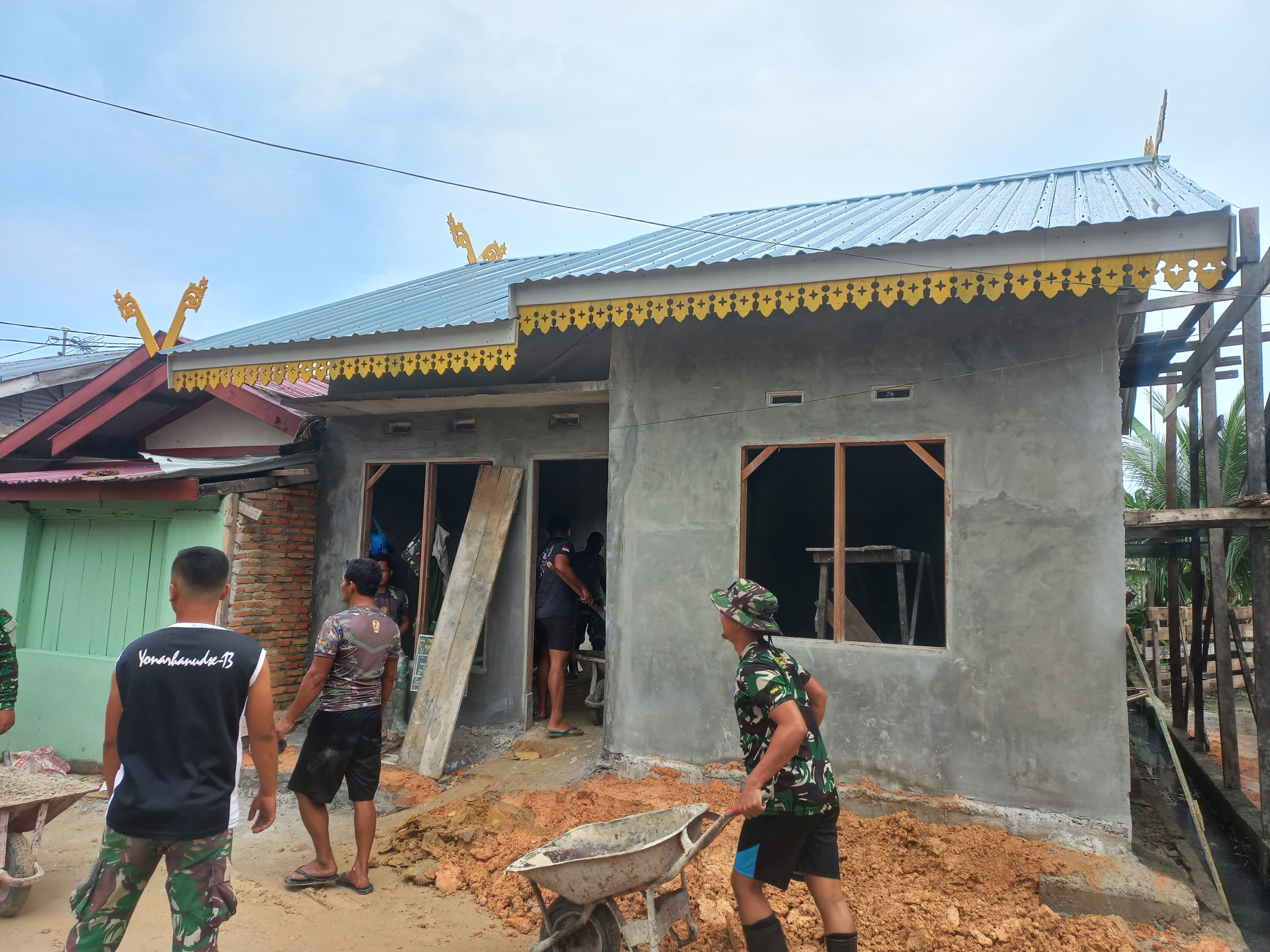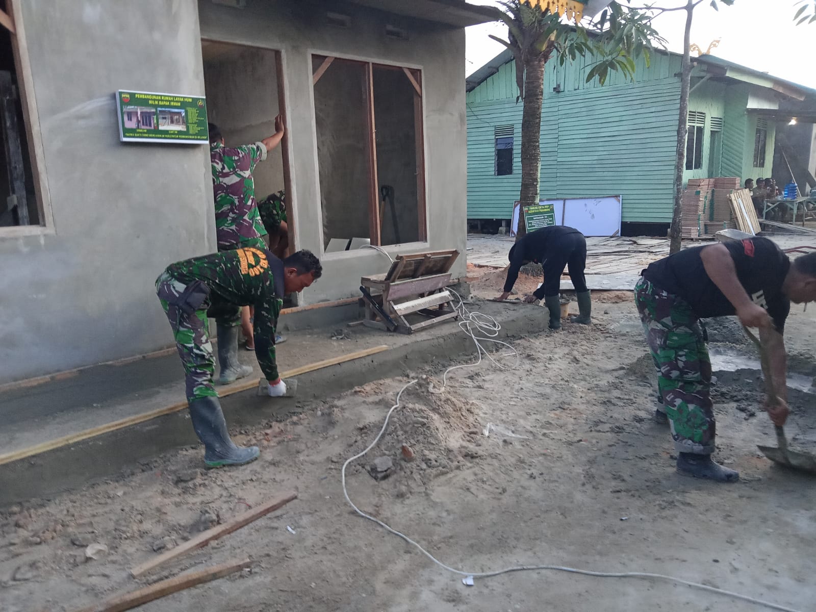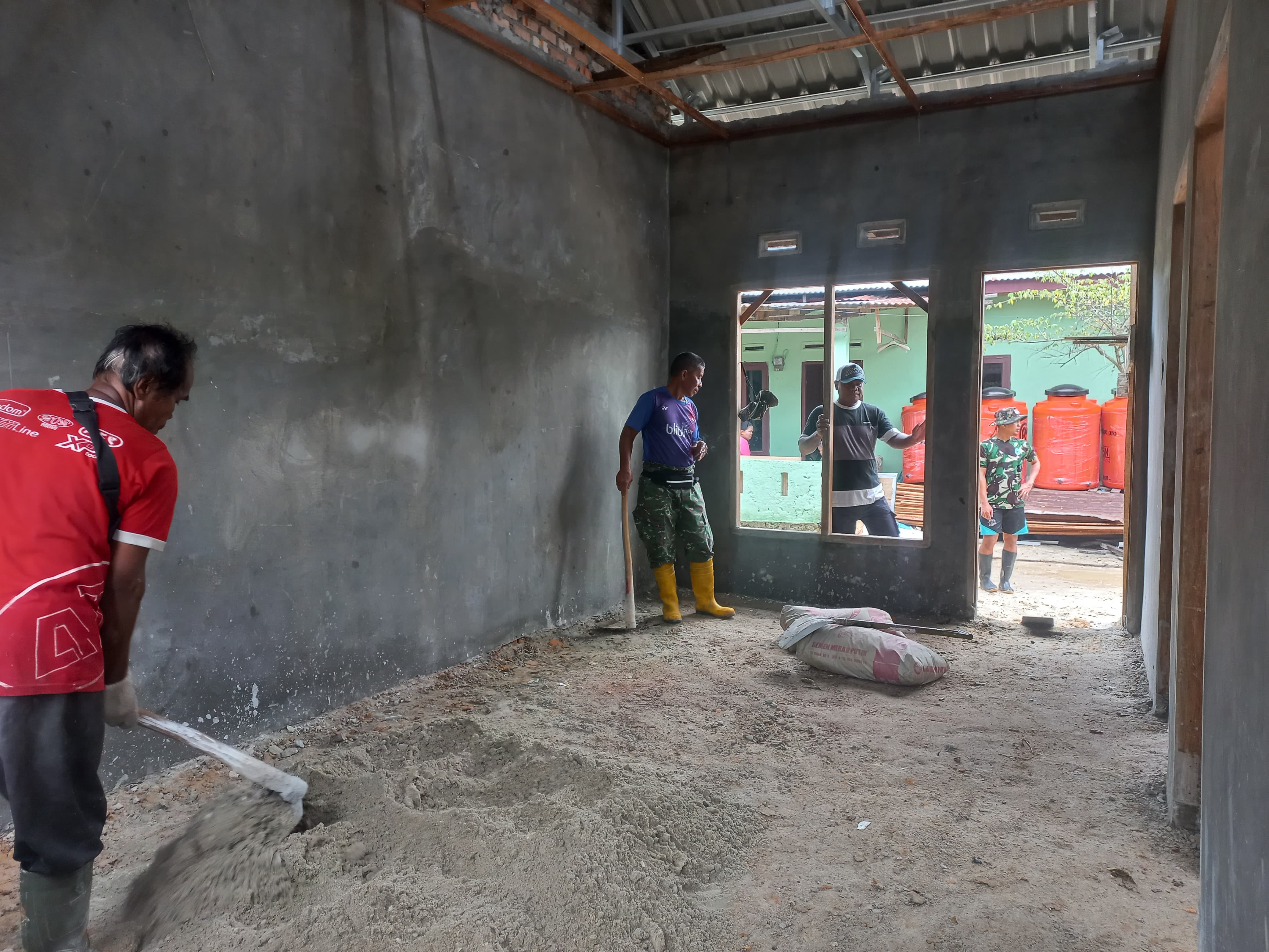 Anggota Satgas TMMD Kodim 0301 Pekanbaru Cekatan Mengaduk Material Selesaikan Plesteran RTLH Milik.