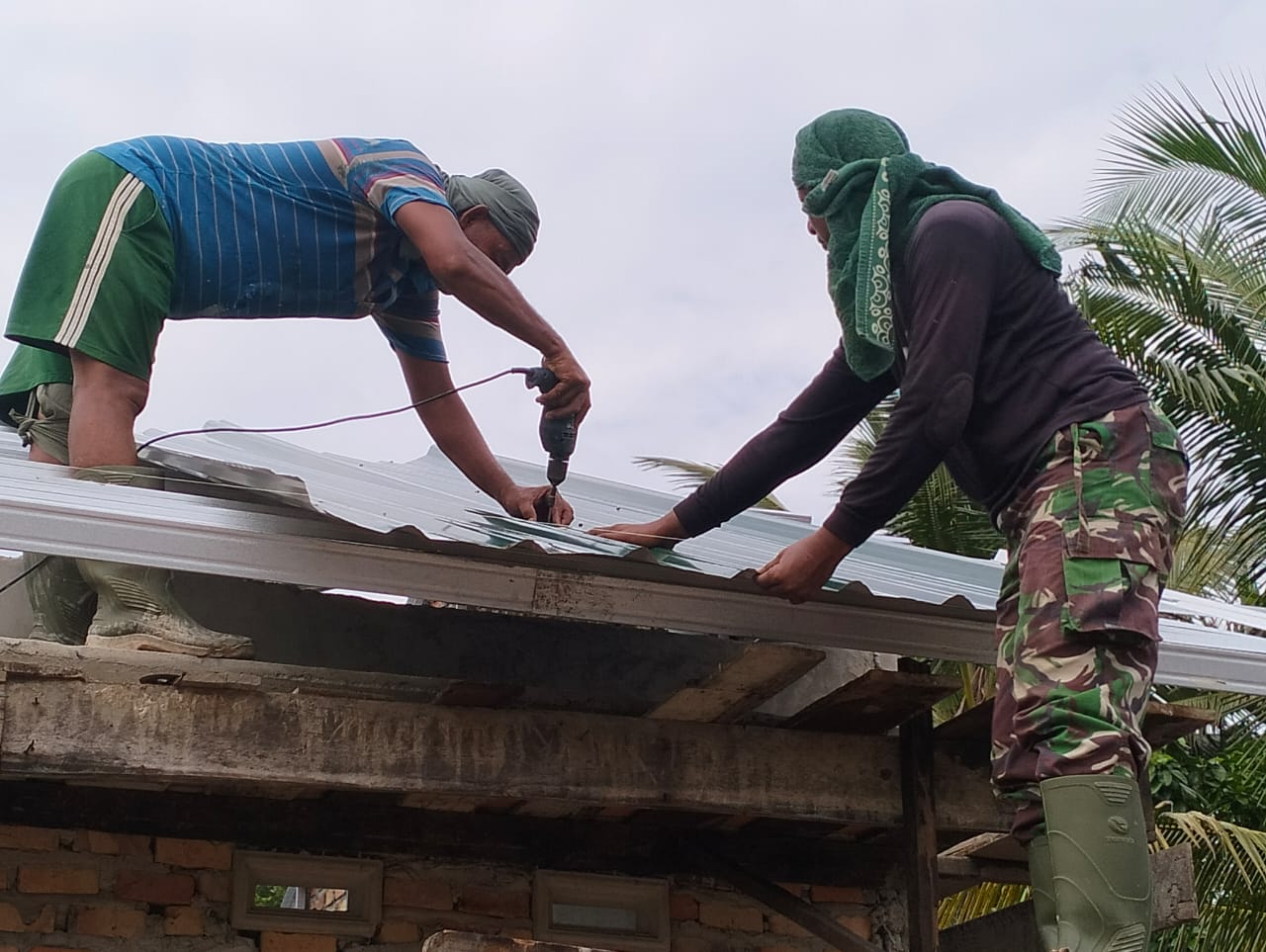 Satgas TMMD dan Warga Fokus Pemasangan Seng RTLH Milik.