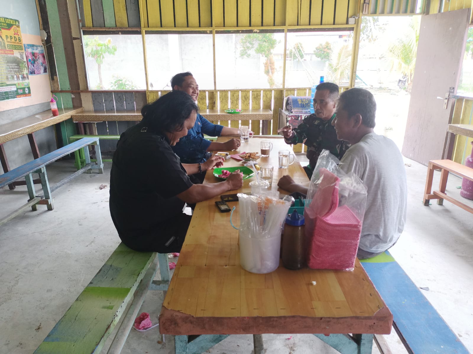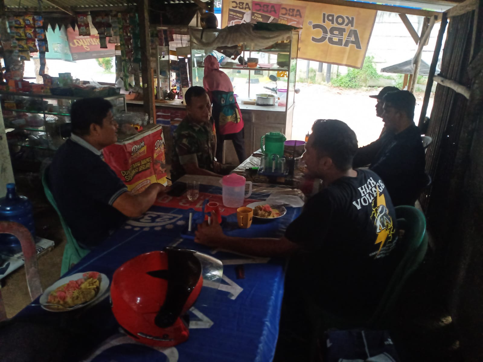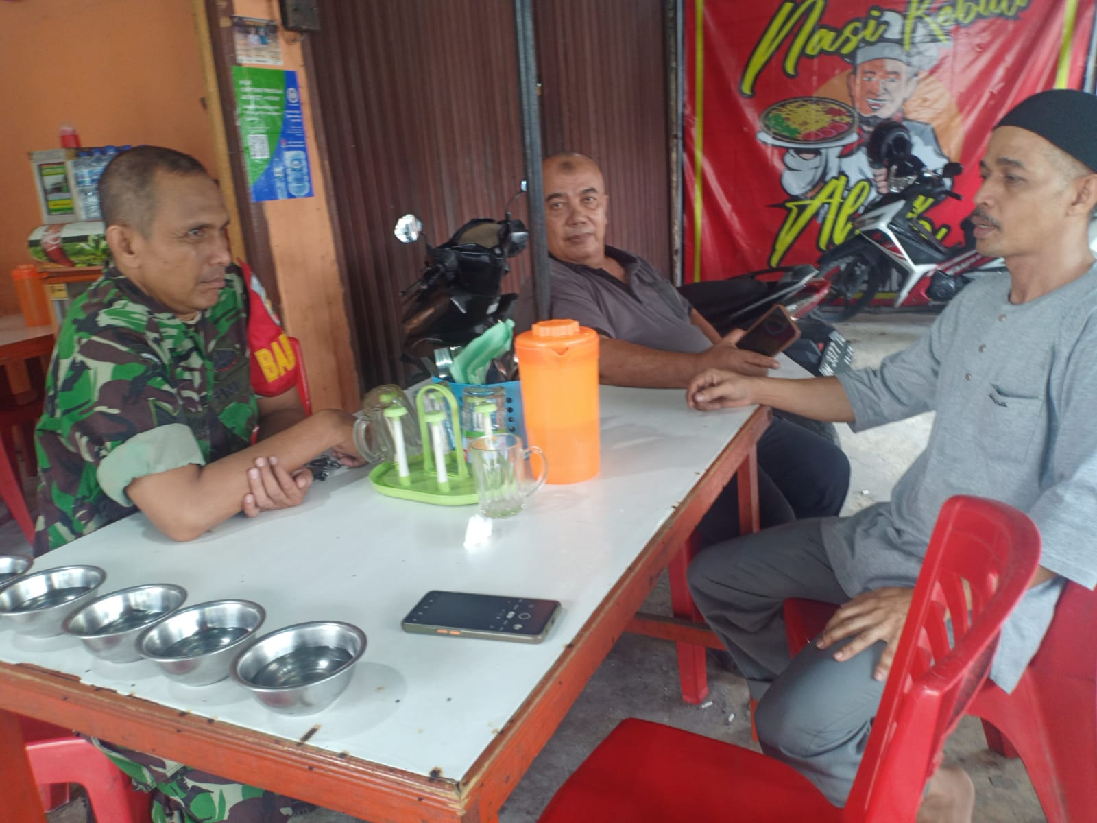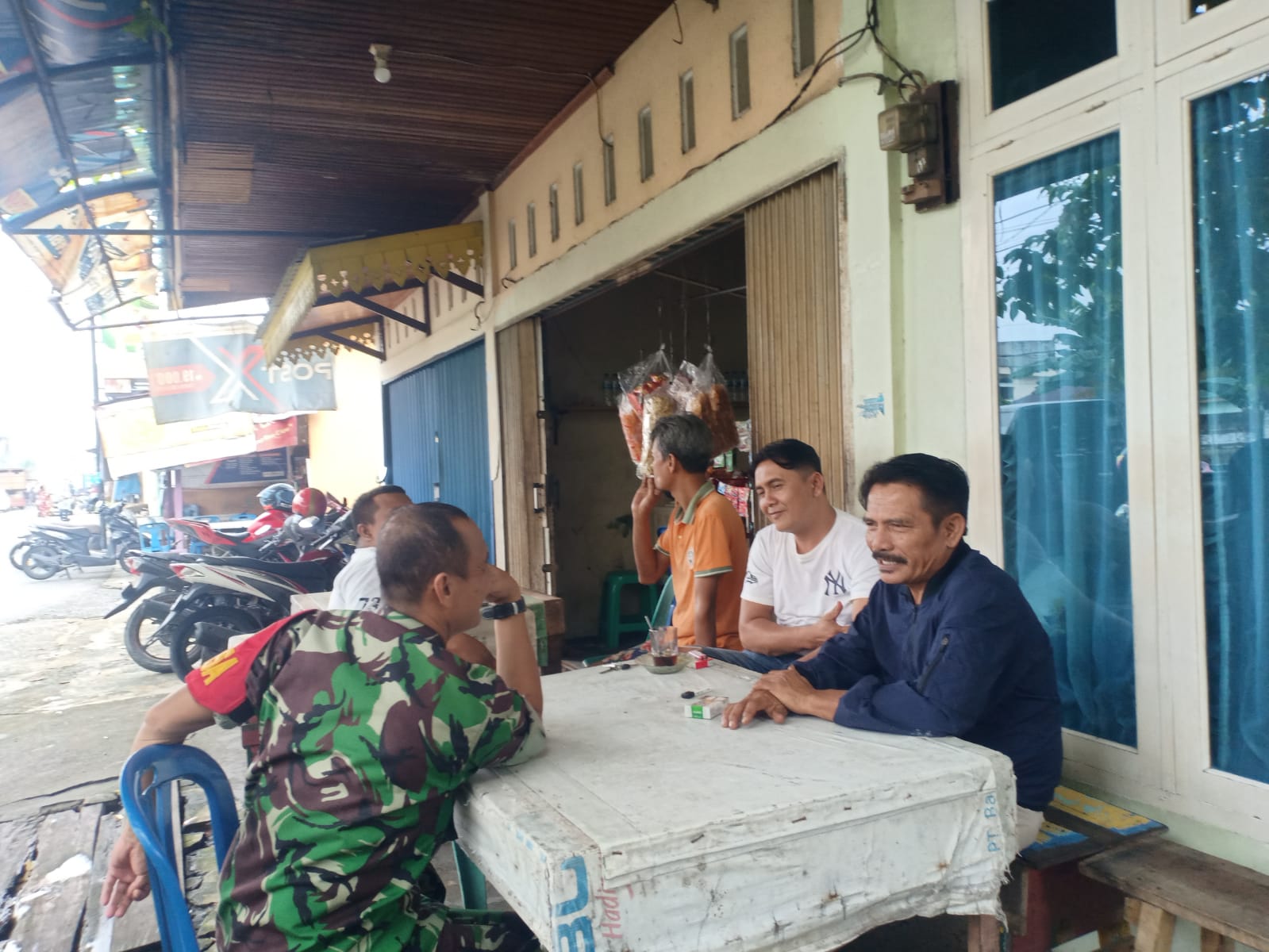 Babinsa Koramil 06/Sukajadi Kodim 0301/PBR, Serma J Tanjung melaksanakan kegiatan Komsos dengan Ketua RW 22 dan warga binaan sambil menikmati sarapan pagi lontong ditemani segelas kopi salah satu warung Jalan Datuk Tunggul Kelurahan Sidomulyo Barat.