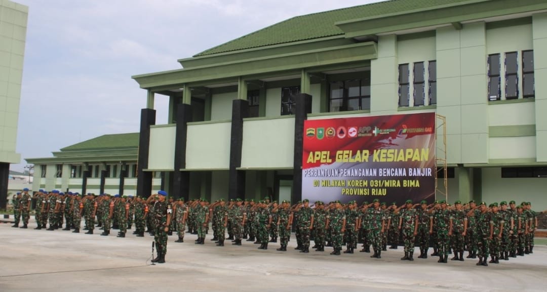 Komandan Kodim 0301/Pekanbaru, Kolonel Kav Yuli Eko Hadiyanto, S. Sos menghadiri Apel gelar kesiapan perbantuan penanganan bencana banjir di wilayah teritorial Korem.