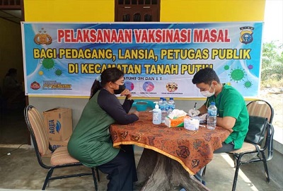 Kapolsek Tanah Putih bersama Kepala Urusan Kesehatan (Paur Kes) Bag Sumda Polres Rokan Hilir memberikan vaksinasike warga lansia.
