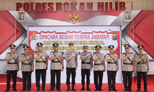 Kapolres Rohil AKBP Andrian Pramudianto SH SIK MSi memimpin upacara serah terima jabatan (Sertijab) Kasat Binmas, Kapolsek Rimba.