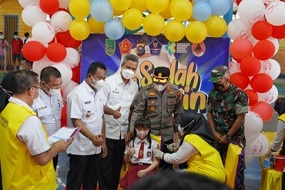 Kapolres Rohil AKBP Nurhadi Ismanto meninjau vaksinasi anak usia 6-11 tahun di Sekolah Dasar (SD) Yayasan Pelita.