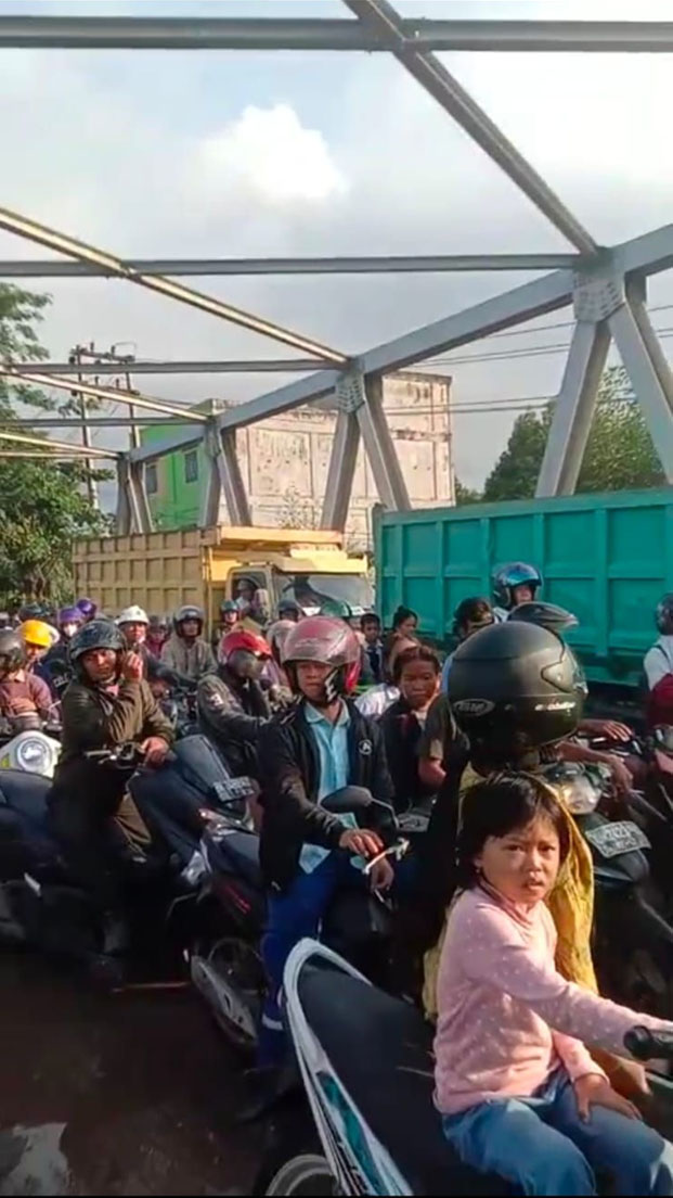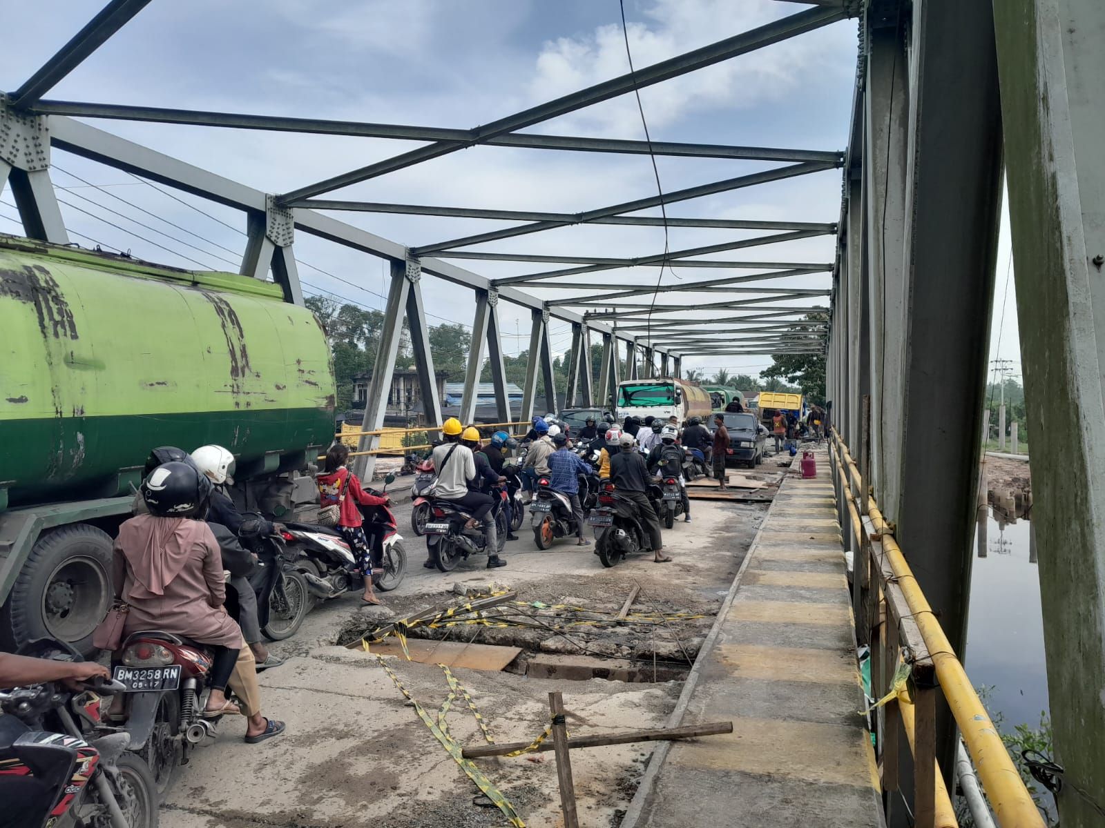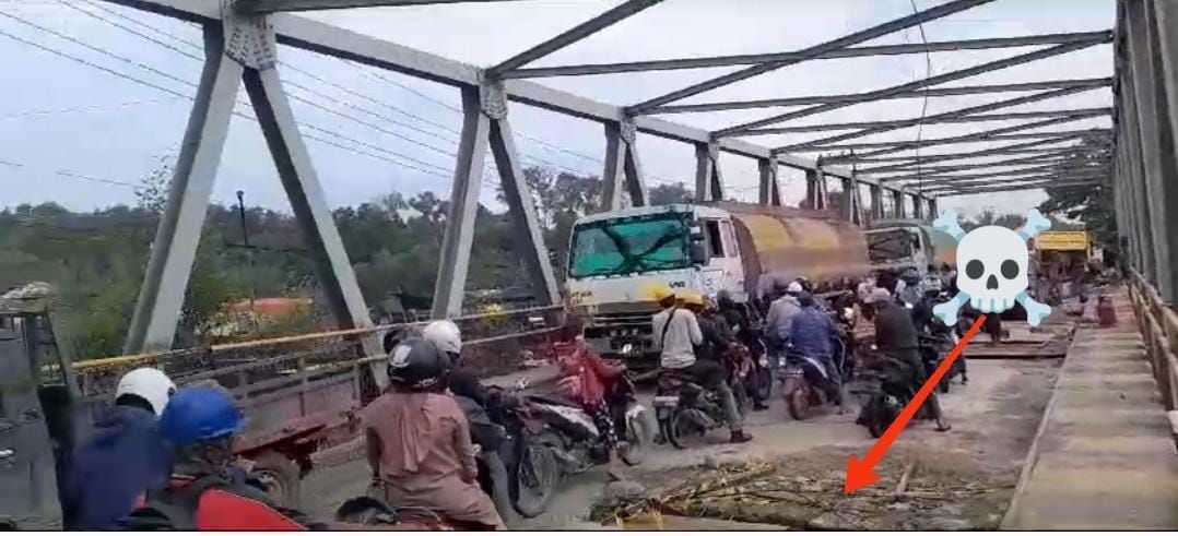 Krisis Jembatan Sungai Mesjid Kelurahan Bangsal Aceh Kecamatan Sungai Sembilan Kota Dumai jangan dibiarkan berlama lama Senin 5 Februari 2024 terjadi kemacetan diperkirakan ratusan sepeda motor terjebak diatas.