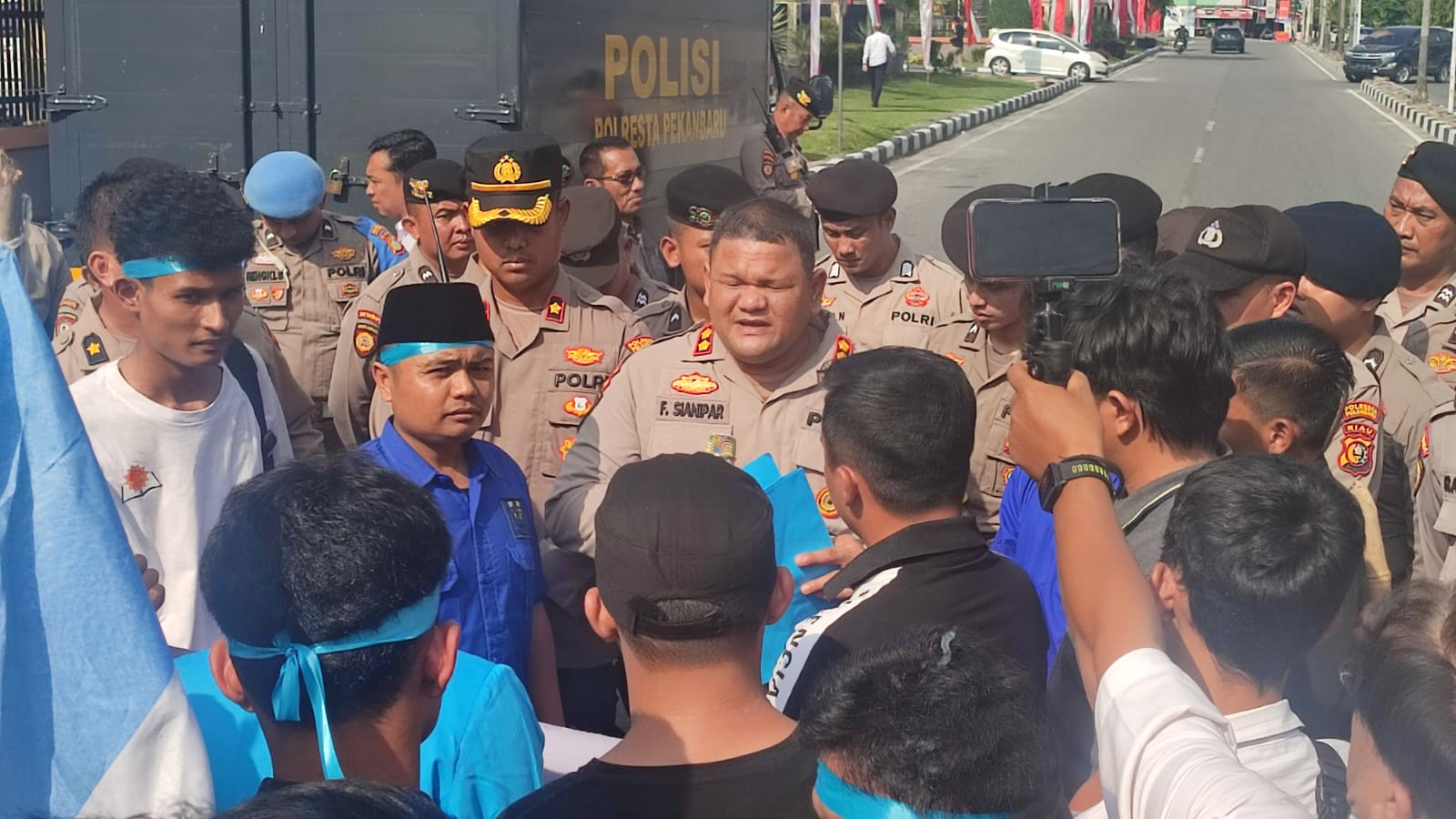 Ratusan massa yang tergabung dalam Komite Nasional Pemuda Indonesia (KNPI) menggelar aksi unjuk rasa di perempatan Jalan Pattimura-Jalan WR Supratman-Abdul Muis, hanya beberapa meter dari gerbang Mapolda Riau Jalan Pattimura, Pekanbaru, Senin.