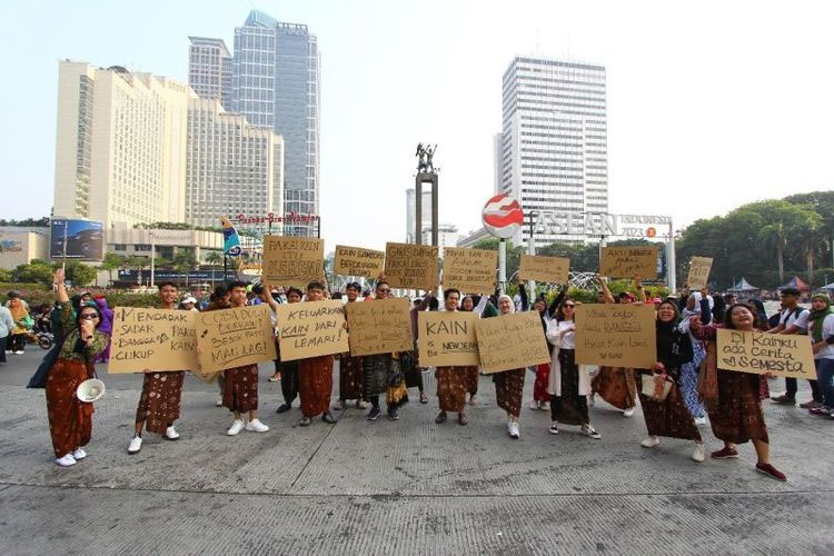 Sejumlah orang mengampanyekan pemakaian kain gambo di Jakarta, Minggu (8/10/2023) sebagai tren pakaian untuk melawan kerusakan lingkungan hidup..