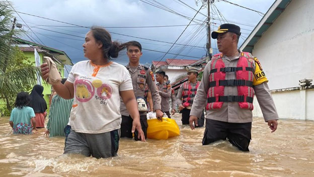 Hujan deras membuat air Sungai Batang Lubuh di Kabupaten Rokan Hulu, Riau meluap. Dampaknya sejumlah jalan di kawasan pemukiman tergenang hingga 30.