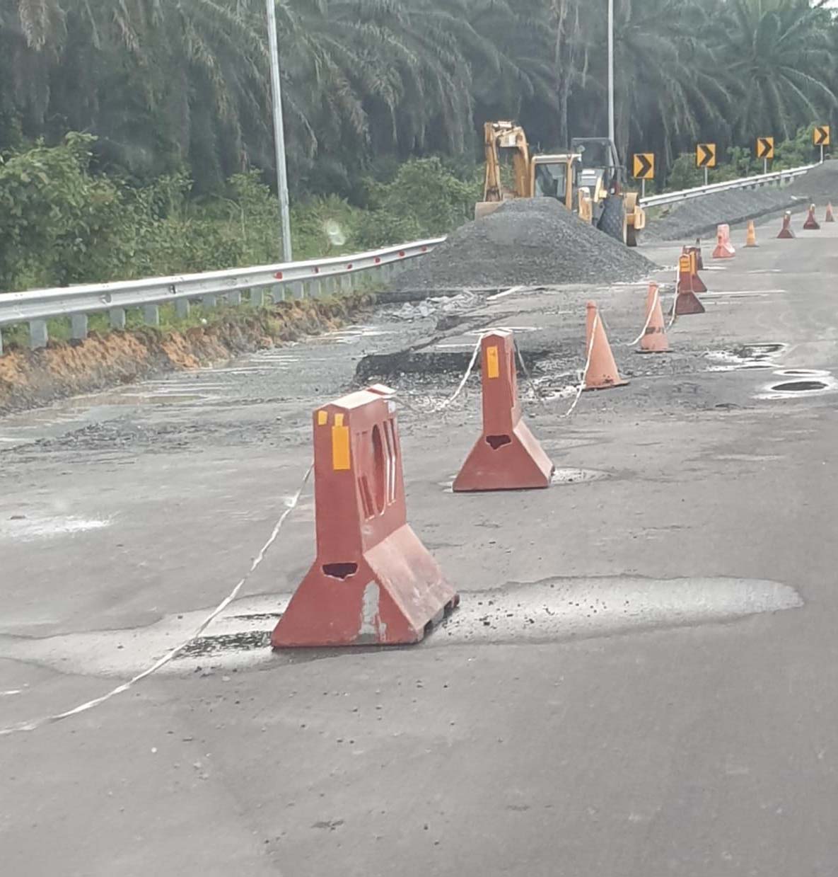 Sementara itu Pantauan mimbarnegeri.com dilapangan Minggu (21/11/2021) menyebutkan bahwa perbaikan ruas Jalan Tol percis di persimpangan ramp KM 96 menuju pintu gerbang Tol Dumai masih saja berlangsung, tumpukan material pada bahu Jalan Tol “menggunung” merusak pandangan karena alat berat dan material berupa batu agregat menyatu dengan alat berat berada pada posisi bahu Jalan Tol. Selain itu masih saja terdapat kerusakan ruas Jalan Tol pada posisi ramp KM. 60 han menuju kota Dumai pada Badan Jalan Tol terdapat kerusakan, ruas Jalan Tol berlobang. Lobang dengan ditandai dengan cat warna putih (purba)