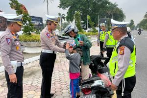 Peduli Keselamatan, Polda Riau Bagikan Helm ke Pengendara