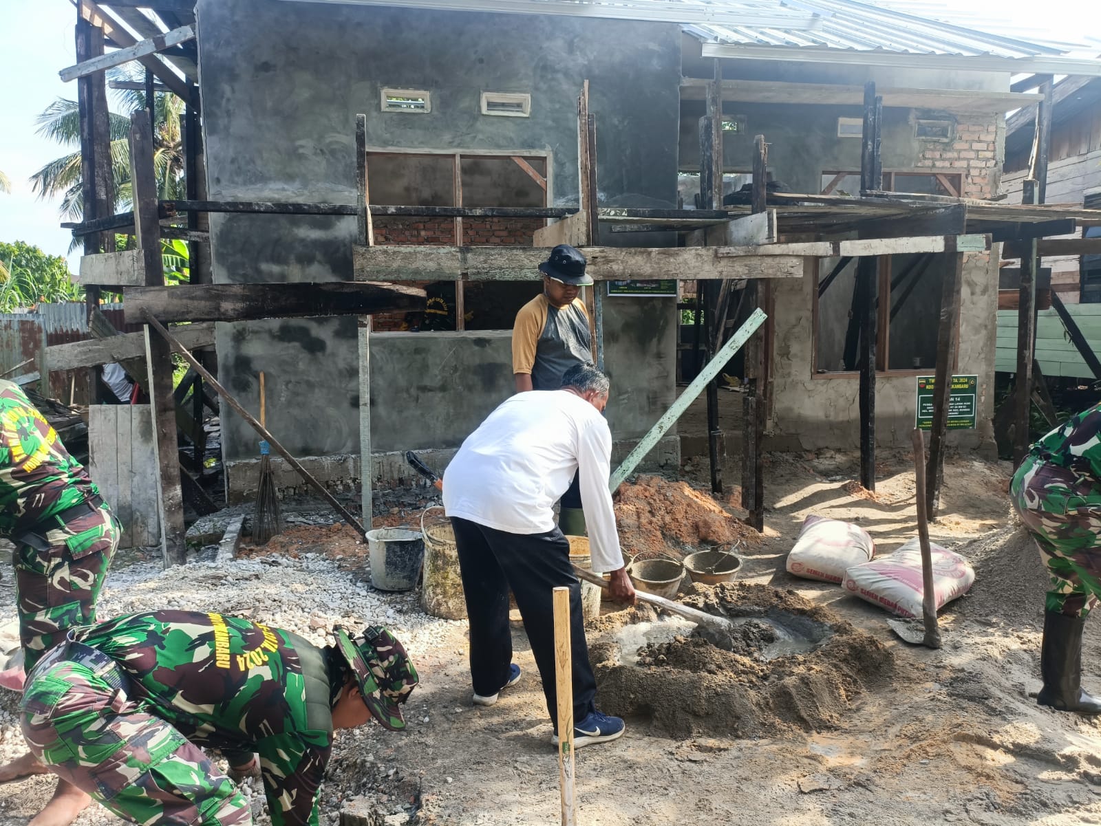 Peltu Adi Yusuf, salah satu anggota Satgas TMMD reguler ke 120 mengatakan adukan semen bercampur dengan pasir dan air untuk pengecoran rumah tidak layak huni, kini cor teras lantai belakang rumah tidak layak huni milik Nasrizal.