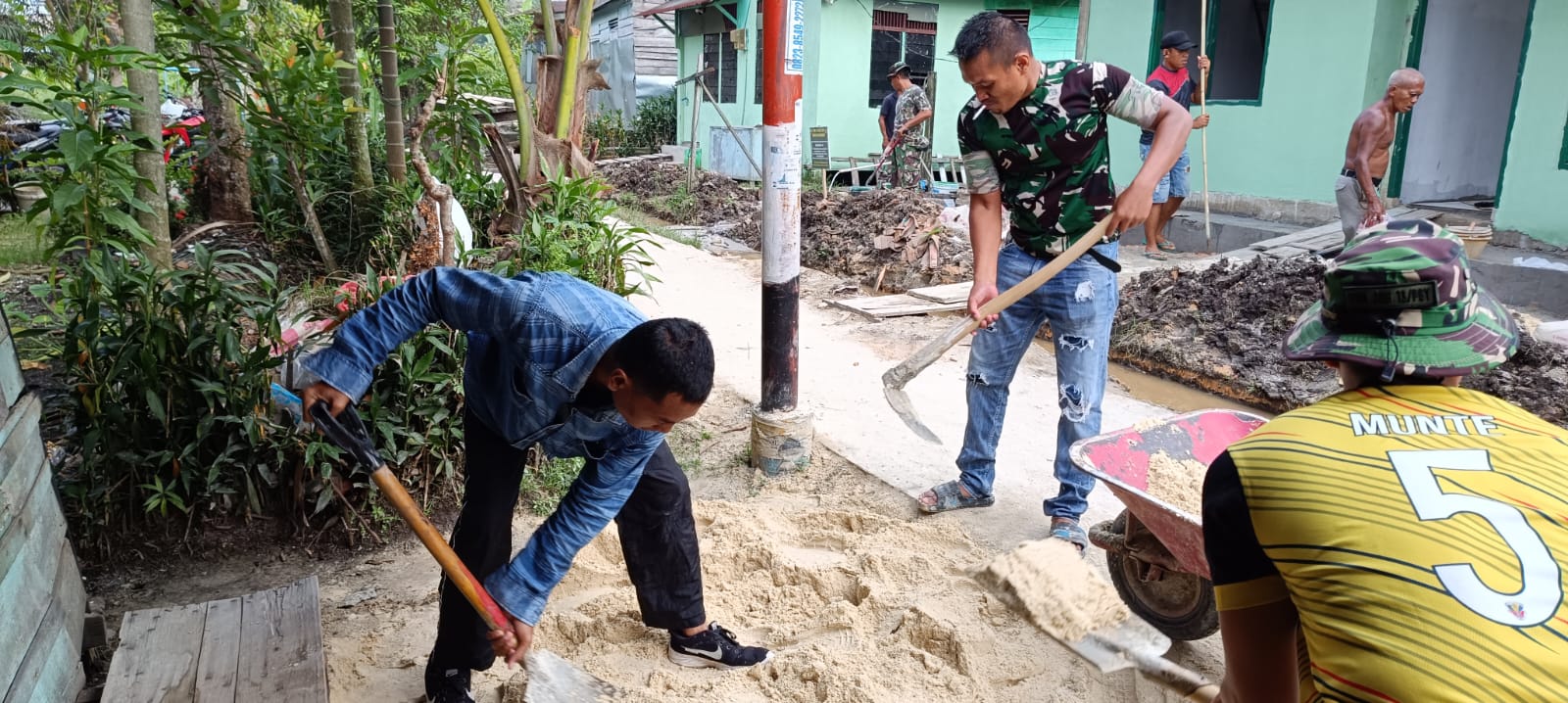 Anggota Satgas TMMD 120 secara bergantian dan bergotongroyong bersama warga mengaduk pasir dan semen untuk pengecoran teras belakang rumah milik Nasrizal, supaya proses rehab dapat diselesaikan dengan tepat waktu. (Pendim)
