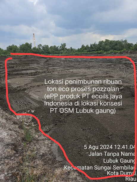 Lokasi galian penimbunan ePP tidak jauh dari pantai laut perairan Selat Rupat Dumai jaraknya sekitar 70 han meter dari lokasi konsesi PT. OSM. lokasi galian tersebut dijadikan dumping ePP (Eco Prosess Pozolan) prodak PT. Ecoils Jaya Indonesia Lubuk Gaung Sungai Sembilan Dumai.
