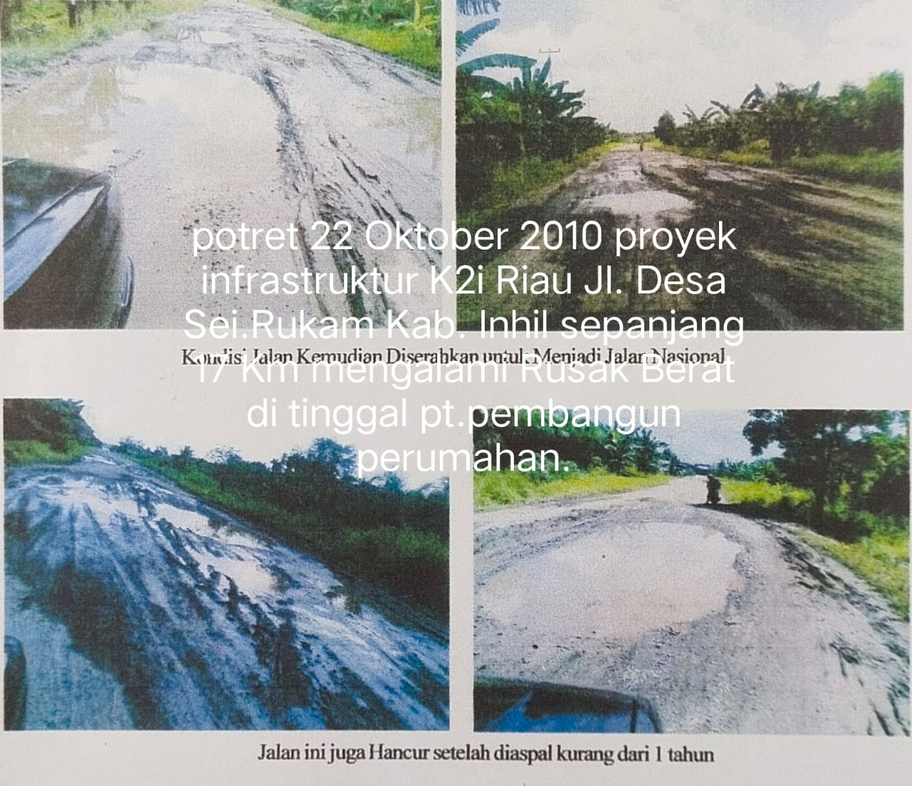 Namun dari penelusuran yang berhasil dirangkum secara visual dan keterangan, beserta data yang berhasil dirangkum dari sumber yang kuat, menyebutkan bahwa Pembangunan Infrastruktur Jalan Program K2i tersebut, menyisakan banyak masalah, contoh misal Jl. Bagan Jaya – Enok TA 2004-2008 Lokasi Desa Suhada Menuju Sungai Rukam sepanjang 17 Km mengalami Rusak Berat sebagai pelaksana kontraktor PT. Pembangunan Perumahan yang ditinggalkan potret 22 Oktober 2010.