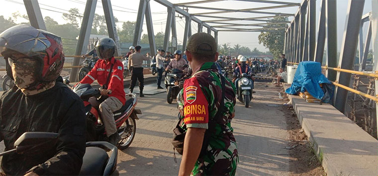 Dan Ramil 03 Kecamatan Sungai Sembilan Kapten INF Hendra dikonfirmasi terkait adanya' anggota TNI - POLRI dan Dishub Dumai serta masyarakat, membenarkan bahwa penertiban yang dilakukan agar kendaraan yang melintas di jembatan tersebut tertib menghindari kemacetan. Petugas melakukan buka tutup pada waktu jam jam tertentu pukul 07.30 Wib,- pukul' 09.00 Wib karena aktifitas karyawan yang akan bekerja di kawasan industri Lubuk Gaung ungkapnya.(Sp)