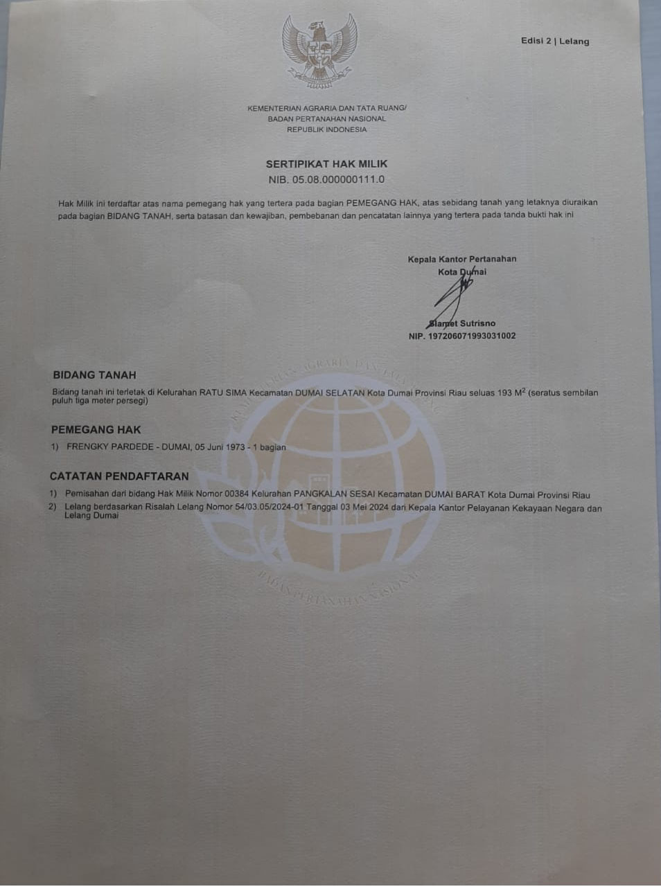 Disebutkan bahwa bidang tanah terletak di Kelurahan Ratu Sima Kecamatan Dumai Selatan Dumai Provinsi Riau seluas 193 M2. Pemegang Hak Frengky Pardede. Catatan pendaftaran : 2) Lelang berdasarkan Risalah Lelang No. 54/03.05/2024-01 tanggal 03 Mei 2024. Padahal lanjutnya bahwa sertifikat Hak Milik 01157 Kelurahan Pangkalan Sesai masih berperkara dalam Gugatan perdata Nomor : 34/PDT.G/2024/PN.DUM tanggal 20 Juni 2024. Bahwa PT. BANK PAN Indonesia Cabang Umum Pekanbaru sebagai tergugat 1. Kantor Pelayanan Kekayaan Negara (KPKNL) sebagai tergugat II Kantor BPN Dumai turut tergugat dan Frengky Pardede sebagai turut tergugat. Justru BPN Dumai menerbitkan sertifikat balik nama atas nama Frengky Pardede kenapa bisa ujarnya keheranan