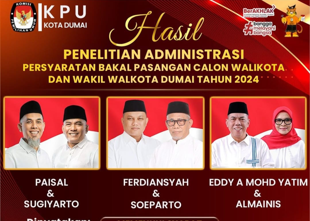 Dumai.mimbarnegeri.com--||Pemilihan Kepala Daerah (Pilkada) Kota Dumai 2024 Komisi Pemilihan Umum (KPU) Kota Dumai Telah menetapkan 3 (tiga) pasangan calon (Paslon) dipastikan ikut bertarung dalam pesta rakyat yang akan diselenggarakan 27 November 2024.