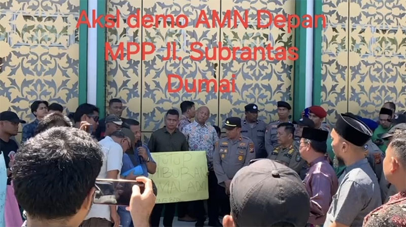 Dumai.Mimbarnegeri.com. Pasca aksi demo Aliansi Masyarakat Dumai (AMD) Jumat, (11/07/2025) depan Mal Pelayanan Publik (MPP) Jl. Subrantas Dumai aksi tersebut mengerahkan massa seratusan orang dalam orasi yang disampaikan Roni dihadapan Satpol PP dan Dinas Pariwisata Dumai menuntut lokasi hiburan malam, agar taat aturan dan lebih disiplin dalam menjalankan usaha hiburan malam “kita sudah serahkan butir butir tuntutan ke Dinas Pariwisata Kota Dumai berjanji Senin (14/07/2025) akan menerbitkan Surat Edaran terhadap 23 usaha hiburan malam”. Namun, hingga hari ini Rabu, (16/07/2025) belum juga terealisasi, keluh Roni Iriandani.