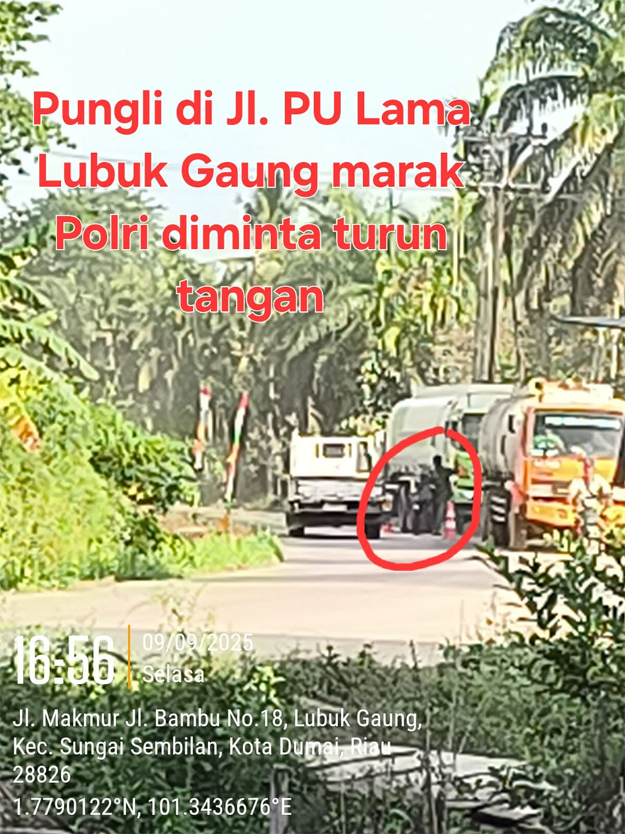 Dumai, Mimbarnegeri.com --|| Selasa, 09 September 2025 beredar vidio yang mempertontonkan adanya dugaan pungutan liar (Pungli) di Jl. Lintas PU Lama Kelurahan Lubuk Gaung Kecamatan Sungai Sembilan. Vidio tersebut berdurasi sekitar 50 detik dikirim keredaksi media ini. warganet yang kebetulan melintas lalu memvisualisasi kegiatan pungutan terhadap truk angkutan barang tujuan ke PT.SDO, PT.AM dan PT. STA yang melintas di Jl. PU Lama tersebut, terekam netizen bahwa ada peristiwa "adu mulut" antara sopir truk dengan warga Jl. PU Lama yang mengaku lahan yang dilintasi truk barang tersebut adalah miliknya yang belum dibayar ganti ruginya oleh pemerintah.