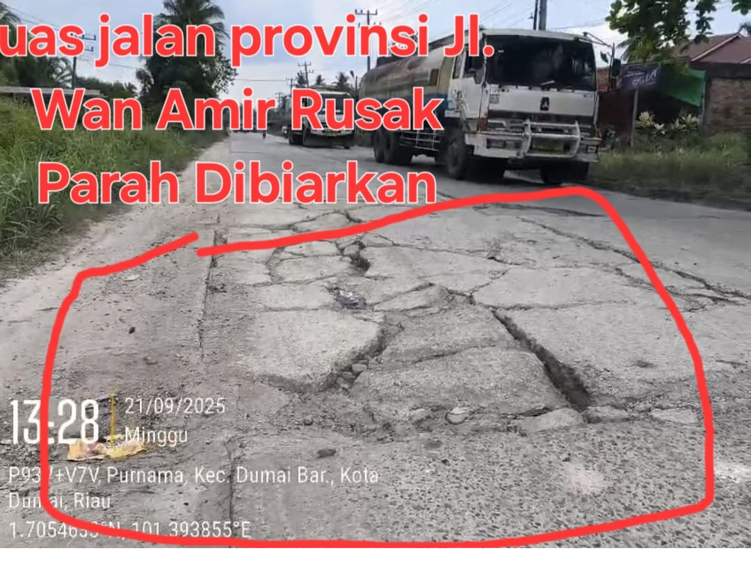 Jalan Nasional Sp. Batang Rohil - Mekarsari Bukit Timah Dumai dan Jalan Provinsi Jl. Wan Amir - Jl. Cut Nyak Dien Lubuk Gaung Rusak Parah Dibiarkan