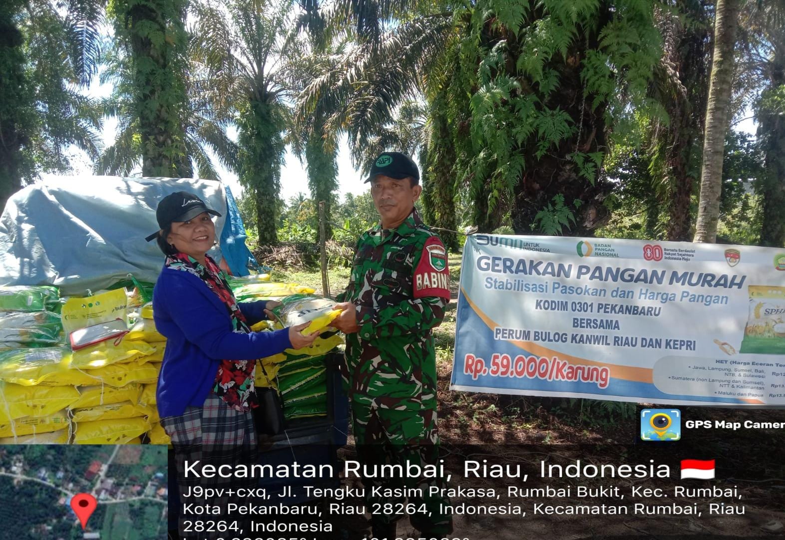 Pekanbaru, Mimbarnegeri.com - Babinsa Koramil 08/Rumbai Barat Kodim 0301/Pekanbaru, Sertu Wahyu Suseno, bersinergi dengan Bulog Kanwil Riau dan Kepri dalam kegiatan Gerakan Pangan Murah (GPM) yang berlangsung di Jalan Tengku Kasim Perkasa RW 01/RT 02, Kelurahan Rantau Panjang, Kecamatan Rumbai Barat, Kota Pekanbaru, Selasa (07/10/2025).