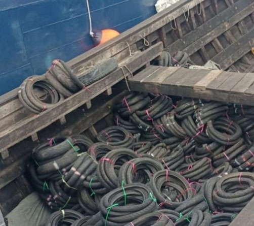 Rabu malam, 1 Oktober 2025, menjadi akhir perjalanan bagi kapal tersebut. Saat didekati Kapal Patroli Satgas BC 10002, petugas menemukan ribuan ban bekas tersusun rapi di geladak dan ruang kargo. Totalnya mencapai 3.750 pieces — seluruhnya diduga berasal dari Port Klang, Malaysia, dengan tujuan akhir Kubu, Kabupaten Rokan Hilir.