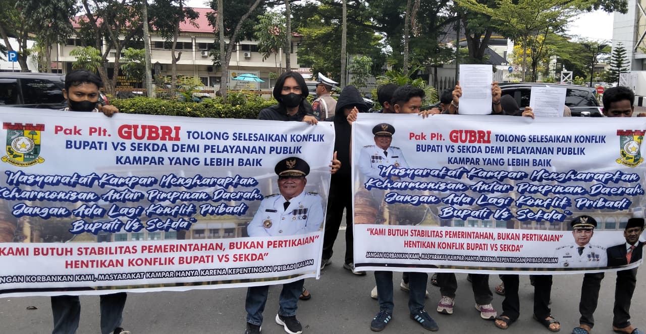 Dalam orasinya, Aan menyampaikan bahwa konflik dua pejabat tinggi tersebut telah menimbulkan dampak serius terhadap pelayanan publik dan jalannya pemerintahan di Kabupaten Kampar.