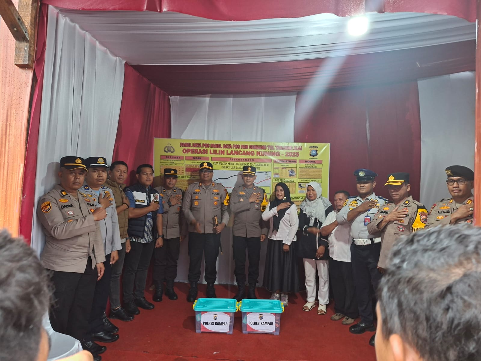 Kapolres AKBP Boby Putra Ramadhan meninjau langsung kondisi pos pengamanan, sarana dan prasarana pendukung, kesiapan personel yang bertugas dalam melaksanakan pengamanan arus lalu lintas dan pelayanan kepada masyarakat, khususnya pengguna jalan tol yang melintas di wilayah XIII Koto Kampar.