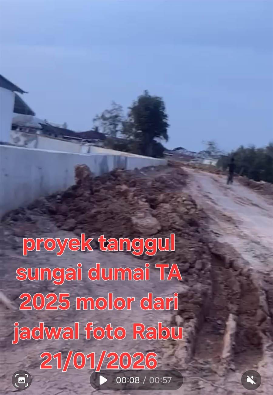 Sekretaris Daerah Kota Dumai Fahmi Rizal ketika dikonfirmasi melalui whatsapp pada Rabu (21/01/2026) malam pukul 20.00 Wib konfirmasi terkait molornya proyek strategis Dumai yakni lanjutan pembangunan GOR Jl. Arifin Ahmad dan proyek Tanggul Sungai Dumai TA 2025 sumber dana APBD hingga berita ini dikirim ke redaksi belum ada jawaban, (sp)