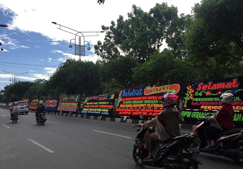 Rata-rata papan bunga terlihat dengan ucapan yang sama. Namun ada juga yang berisi "Selamat Datang Presiden Prabowo dan Wakil Presiden Sandiaga di Bumi Serambi Mekkah dalam rangka menyambut silaturrahmi".