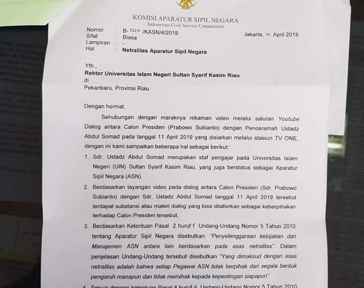 Dalam surat tersebut bahwa pertemuan UAS dengan Prabowo terkait Pilpres 2019. KASN menjelaskan bahwa selaku aparatur sipil negara (ASN) harus netral. Netral dalam artian adalah setiap pegawai ASN tidak berpihak dari segala bentuk pengaruh manapun dan tidak memihak kepada kepentingan siapapun.(hrc)