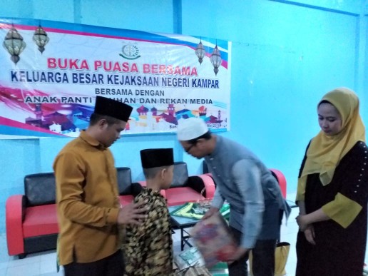 Dwi Antoro bersama istri, sejumlah kepala seksi, jaksa fungsional staf dan belasan wartawan Kampar diantaranya dari organisasi Persatuan Wartawan Indonesia (PWI), IJTI, FWK, IWO dan GWI berbuka puasa bersama bersama puluhan anak yatim dan pengasuh Panti Asuhan Putra Muhammadiyah Bangkinang.