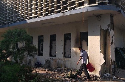 Dinding bagian barat juga rusak parah. Seluruh kaca pecah dan dinding berlubang. Bahkan kerangka dinding terlihat jelas dari jarak jauh.