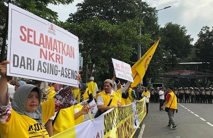 Jakarta -- Massa menamakan diri Gerakan Nasional Kedaulatan Rakyat (GNKR) melakukan aksi demonstrasi Jalan Medan Merdeka Barat, Jakarta Pusat, Jumat (14/6), saat sidang perselisihan hasil pemilihan umum (PHPU) tengah digelar di Mahkamah Konstitusi (MK).