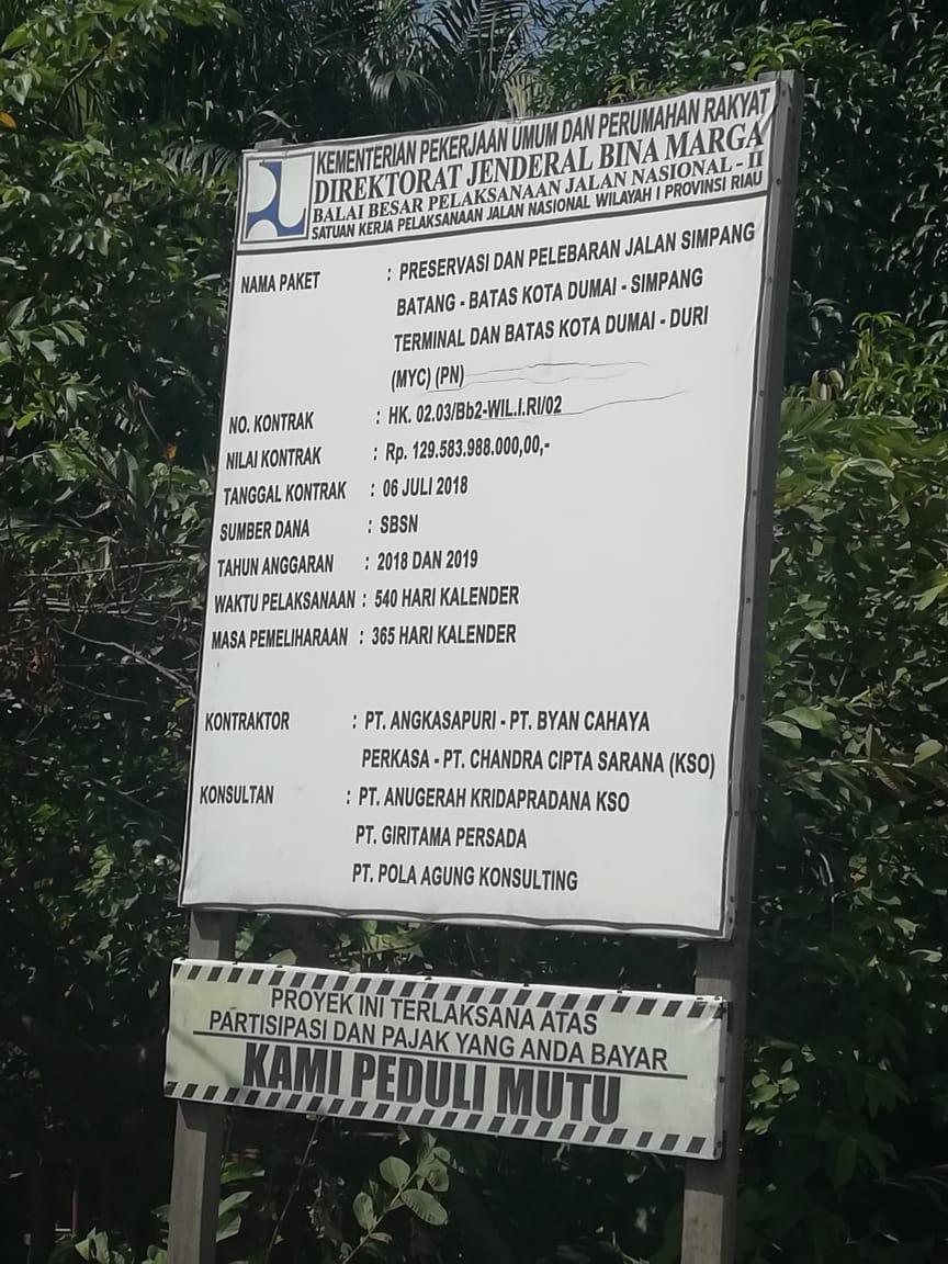 Dumai, Proyek Kementerian Pekerjaan Umum Dan Perumahan Rakyat (PUPR) Direktorat Jenderal Bina Marga Balai Besar Pelaksanaan Jalan Nasional (BBPJN) – II dengan Paket Preservasi dan Pelebaran Jalan Simpang Batang menuju Dumai menjadi sorotan public sebab dalam pelaksanaan proyek pelebaran jalan tersebut dinilai lamban dan tidak sesuai harapan masyarakat.