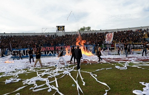 Jumlah supporter yang banyak membuat kerusuhan semakin tak terbendung. Mereka mulai membakar kertas di tribun utara sampai jalan menuju lapangan. Api yang membesar coba dipadamkan oleh mobil pemadam kebakaran yang ikut disiagakan, namun gagal, upaya itu dihalangi para supporter dengan lemparan batu.