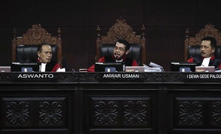 "Amar putusan mengadili, menyatakan dalam eksepsi, menolak eksepsi termohon dan pihak terkait untuk seluruhnya. Dalam pokok permohonan, menolak permohonan pemohon untuk seluruhnya," demikian putusan MK yang dibacakan Anwar dalam sidang di Gedung MK, Jakarta, Kamis (27/6).
