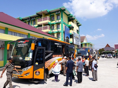 PEKANBARU - Jemaah Calon Haji (JCH) Kelompok Terbang (Kloter) 10 asal Kabupaten Bengkalis tiba di Embarkasi Haji Antara Riau, Sabtu (13/7/2019).