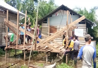 Bersama FKPM dan Ikatan Pemuda Gotong Royong di daerah itu, Kapolsek bersama jajaran saling bahu membahu dalam mengerjakan bedah rumah yang saat ini lokasinya digenangi air.